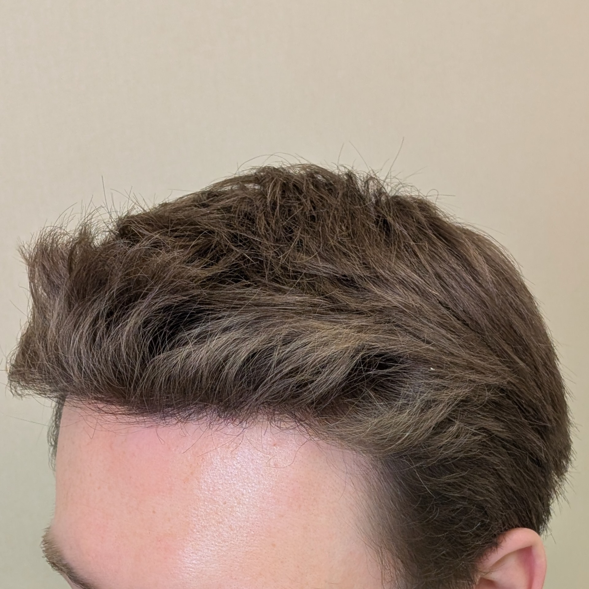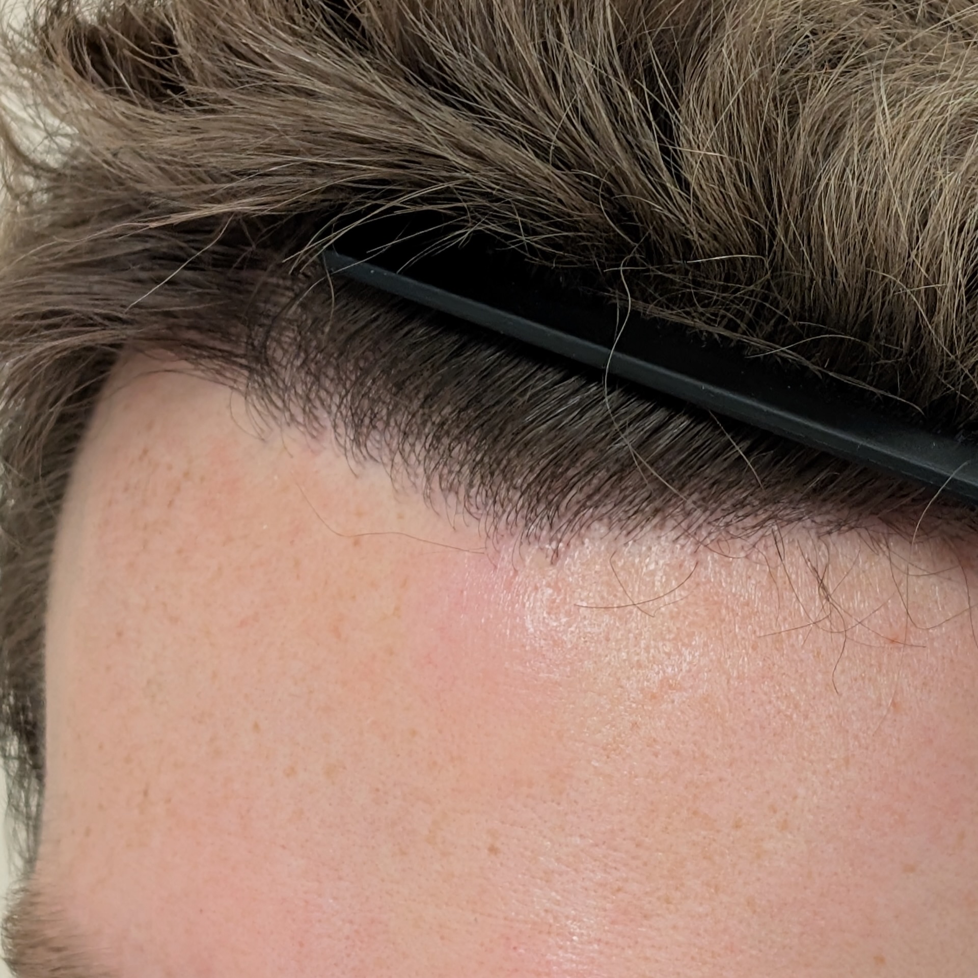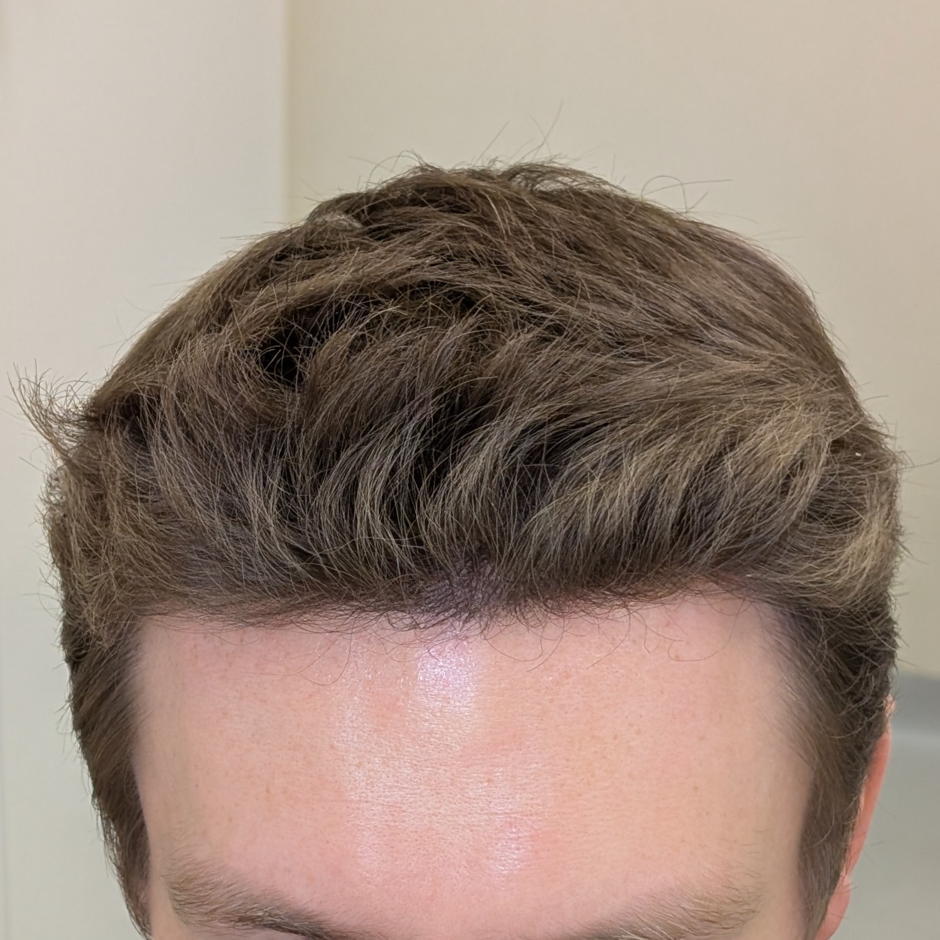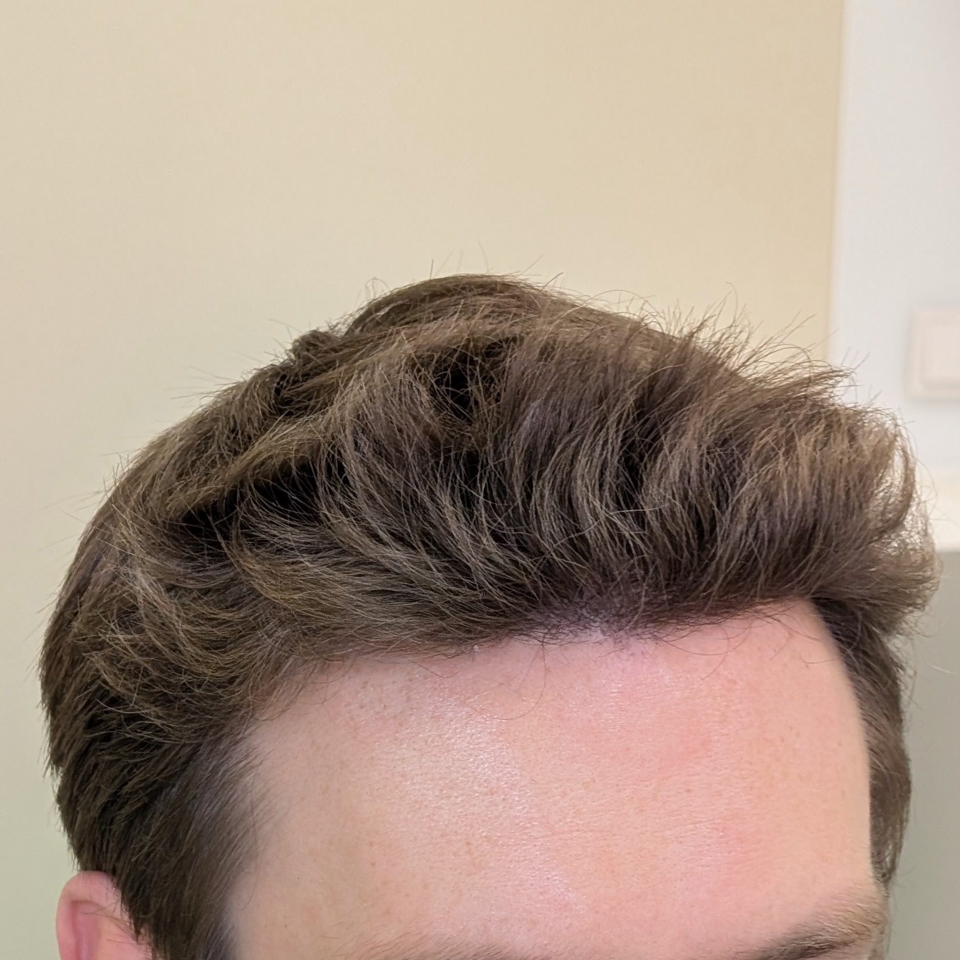 Ten pacjent zgłosił się do nas celem odtworzenia linii włosów, wypełnienia zakoli oraz zagęszczenia okolicy czołowej. Przeszczepiliśmy 2400 mieszków metodą FUE/DHI. Udało nam się uzyskać dobrą gęstość i „płynną” linię włosów, która spełniła oczekiwania pacjenta. Zdjęcia wykonano 8 miesięcy po zabiegu – efekt nie jest jeszcze finalny.