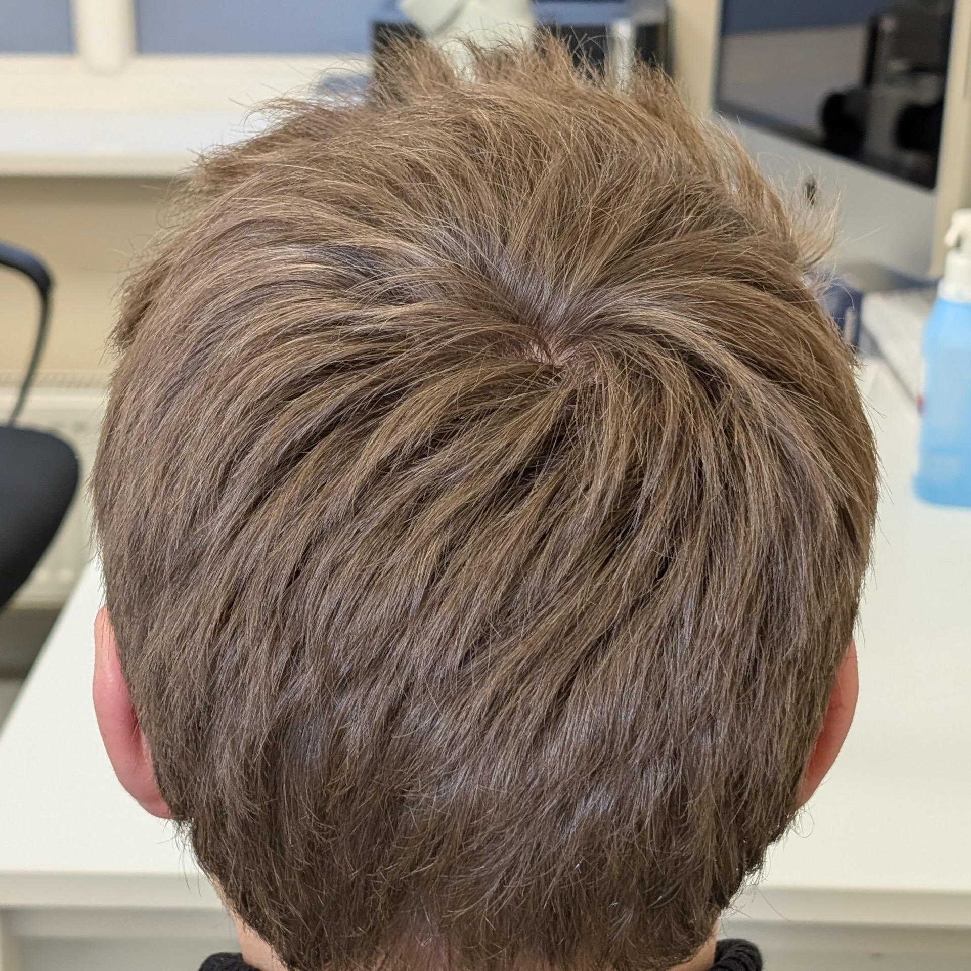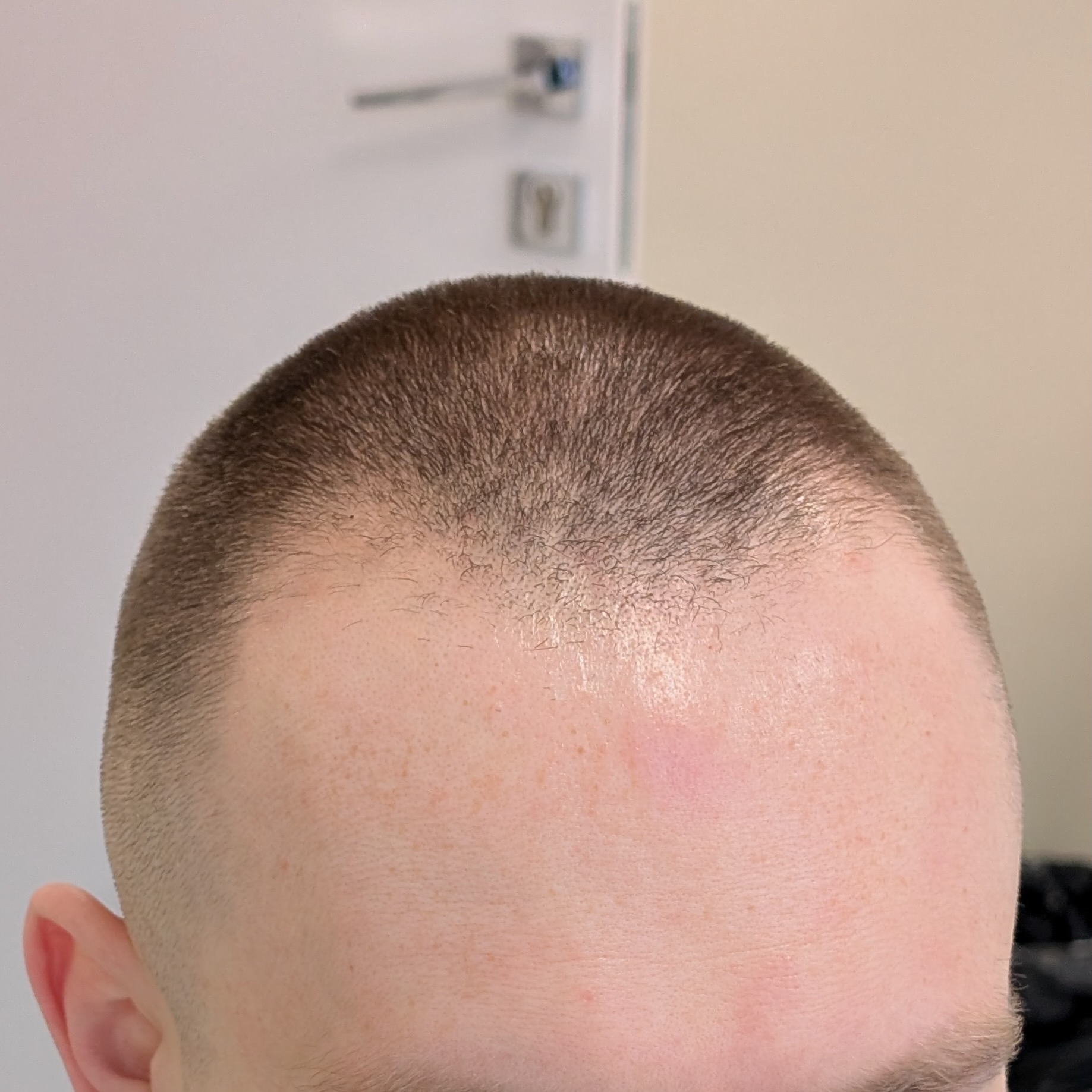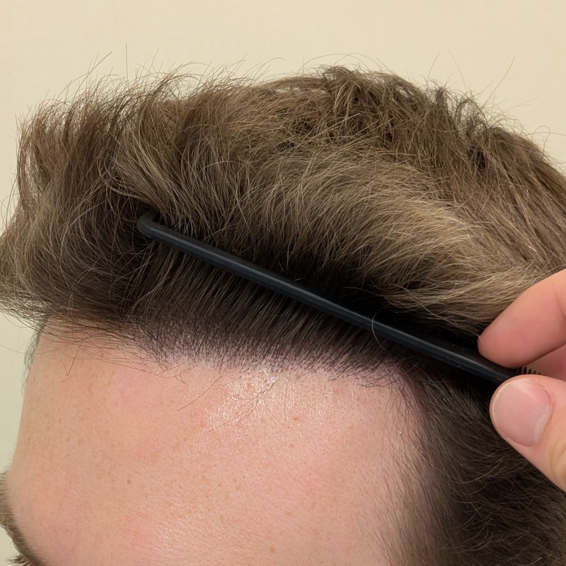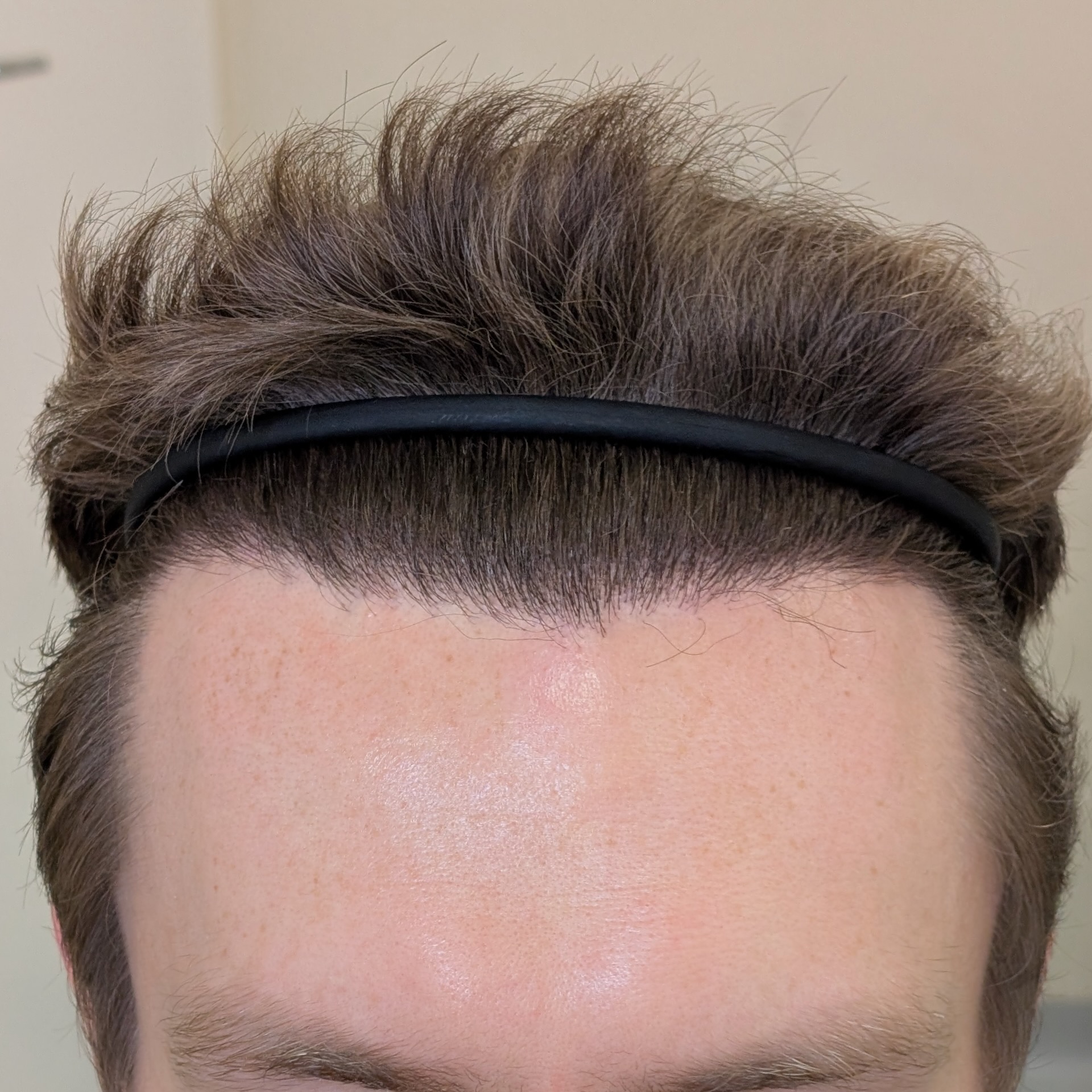 Ten pacjent zgłosił się do nas celem odtworzenia linii włosów, wypełnienia zakoli oraz zagęszczenia okolicy czołowej. Przeszczepiliśmy 2400 mieszków metodą FUE/DHI. Udało nam się uzyskać dobrą gęstość i „płynną” linię włosów, która spełniła oczekiwania pacjenta. Zdjęcia wykonano 8 miesięcy po zabiegu – efekt nie jest jeszcze finalny.