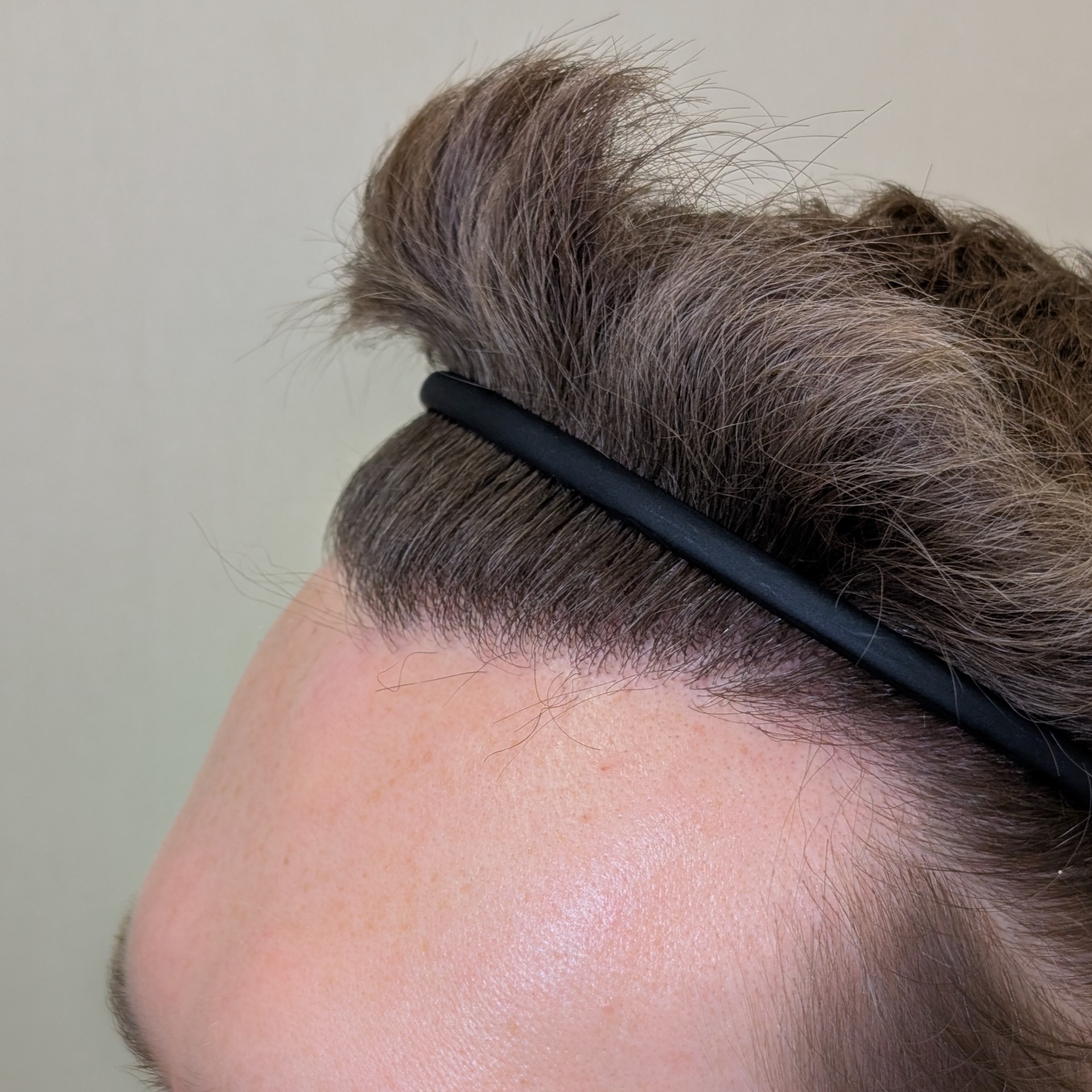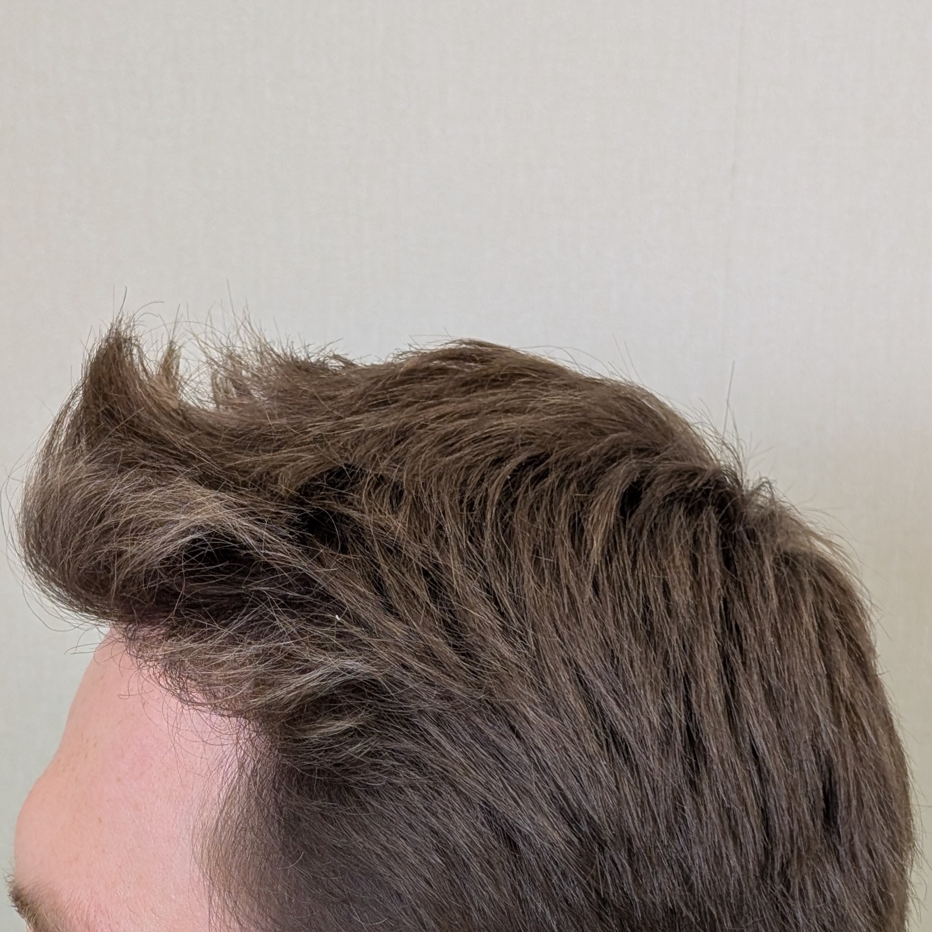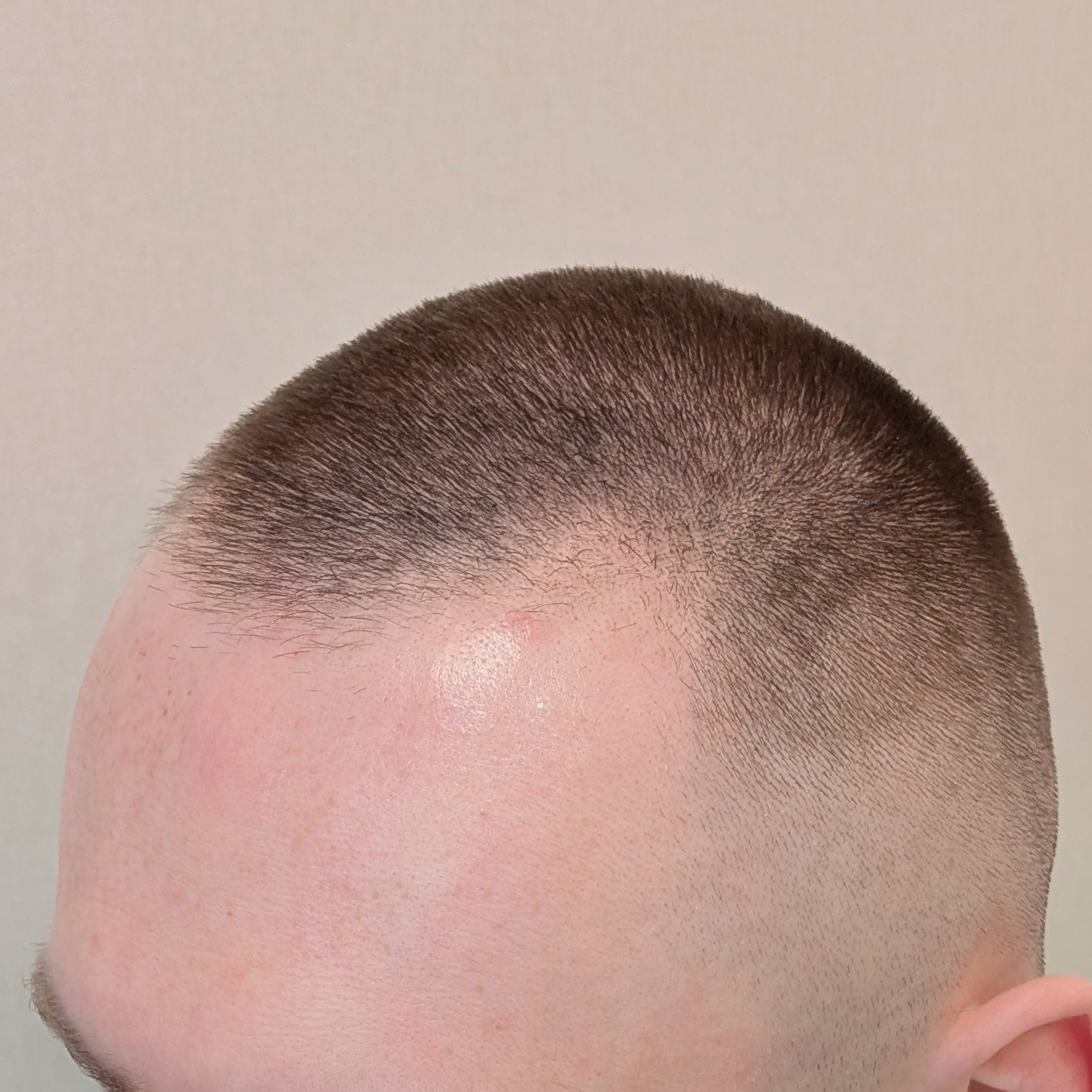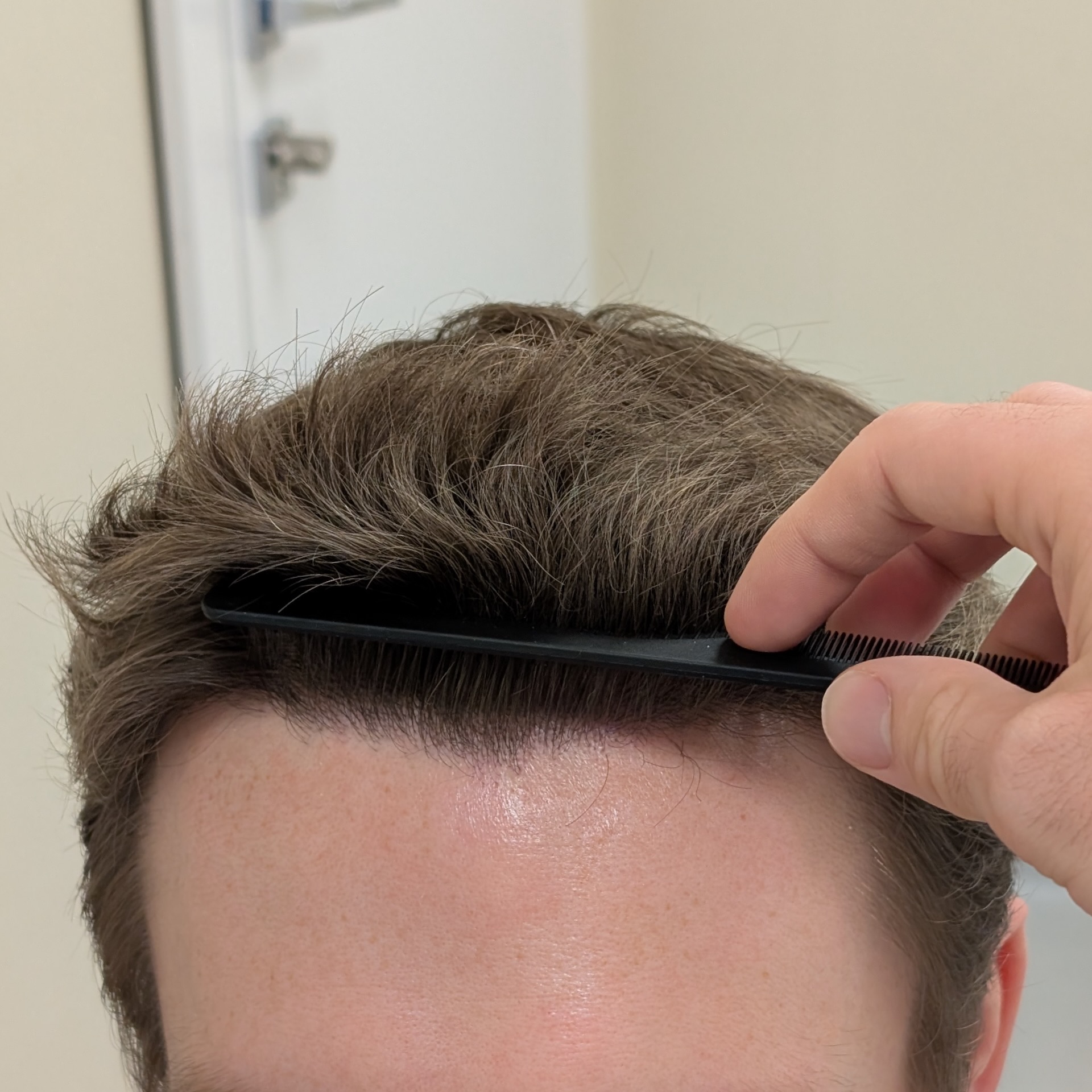 Ten pacjent zgłosił się do nas celem odtworzenia linii włosów, wypełnienia zakoli oraz zagęszczenia okolicy czołowej. Przeszczepiliśmy 2400 mieszków metodą FUE/DHI. Udało nam się uzyskać dobrą gęstość i „płynną” linię włosów, która spełniła oczekiwania pacjenta. Zdjęcia wykonano 8 miesięcy po zabiegu – efekt nie jest jeszcze finalny.