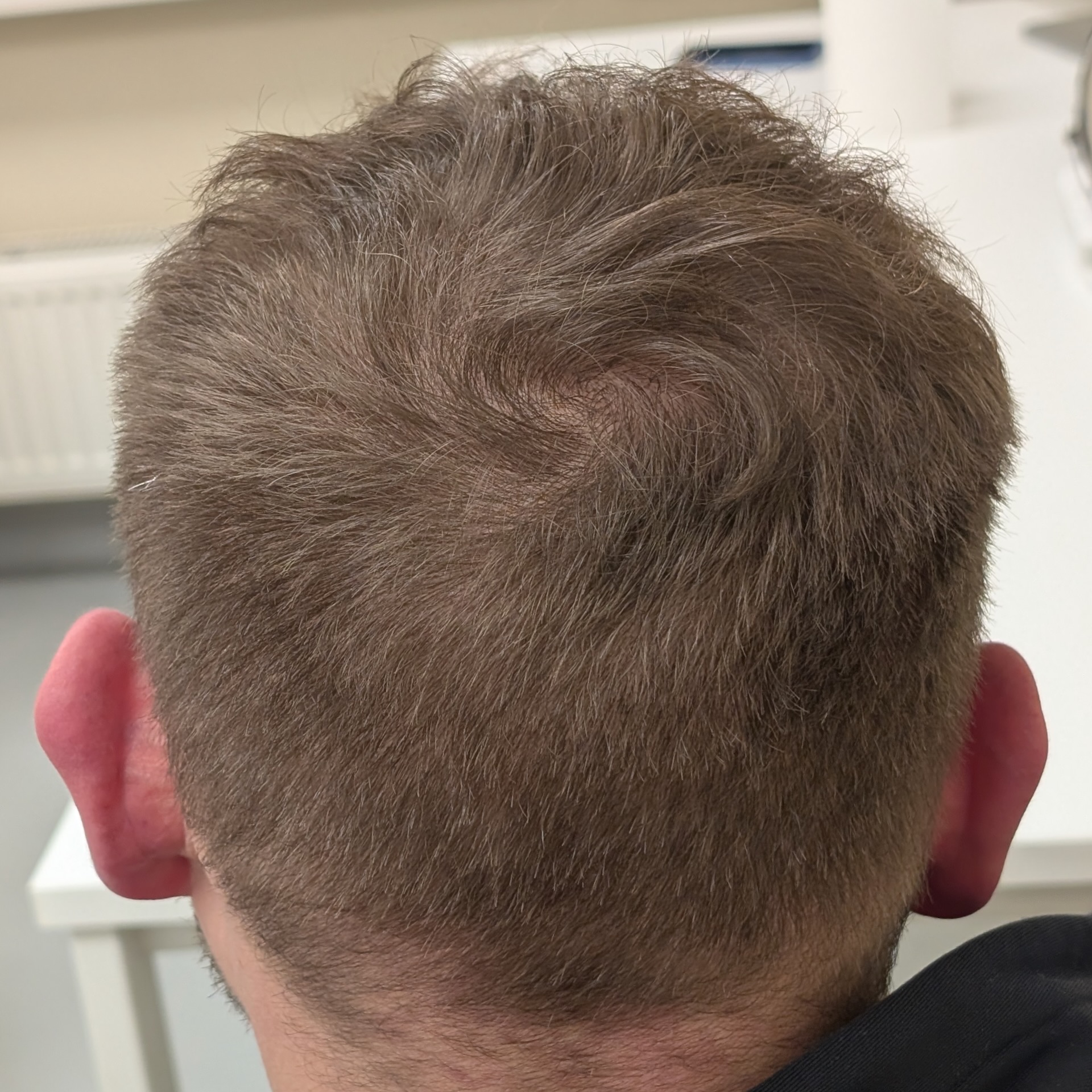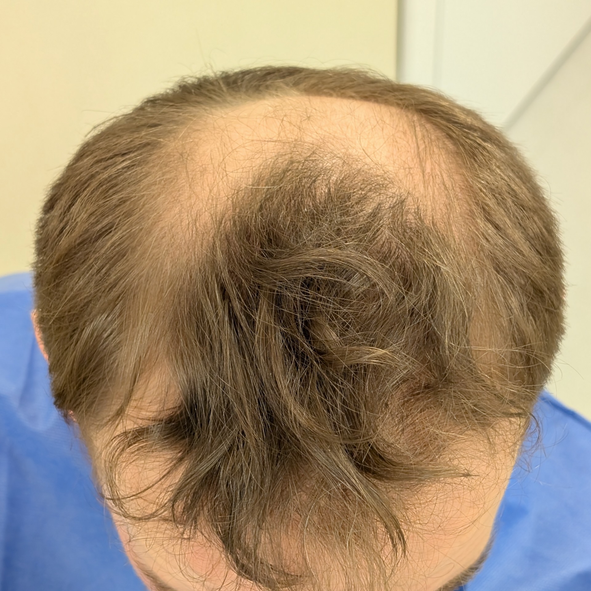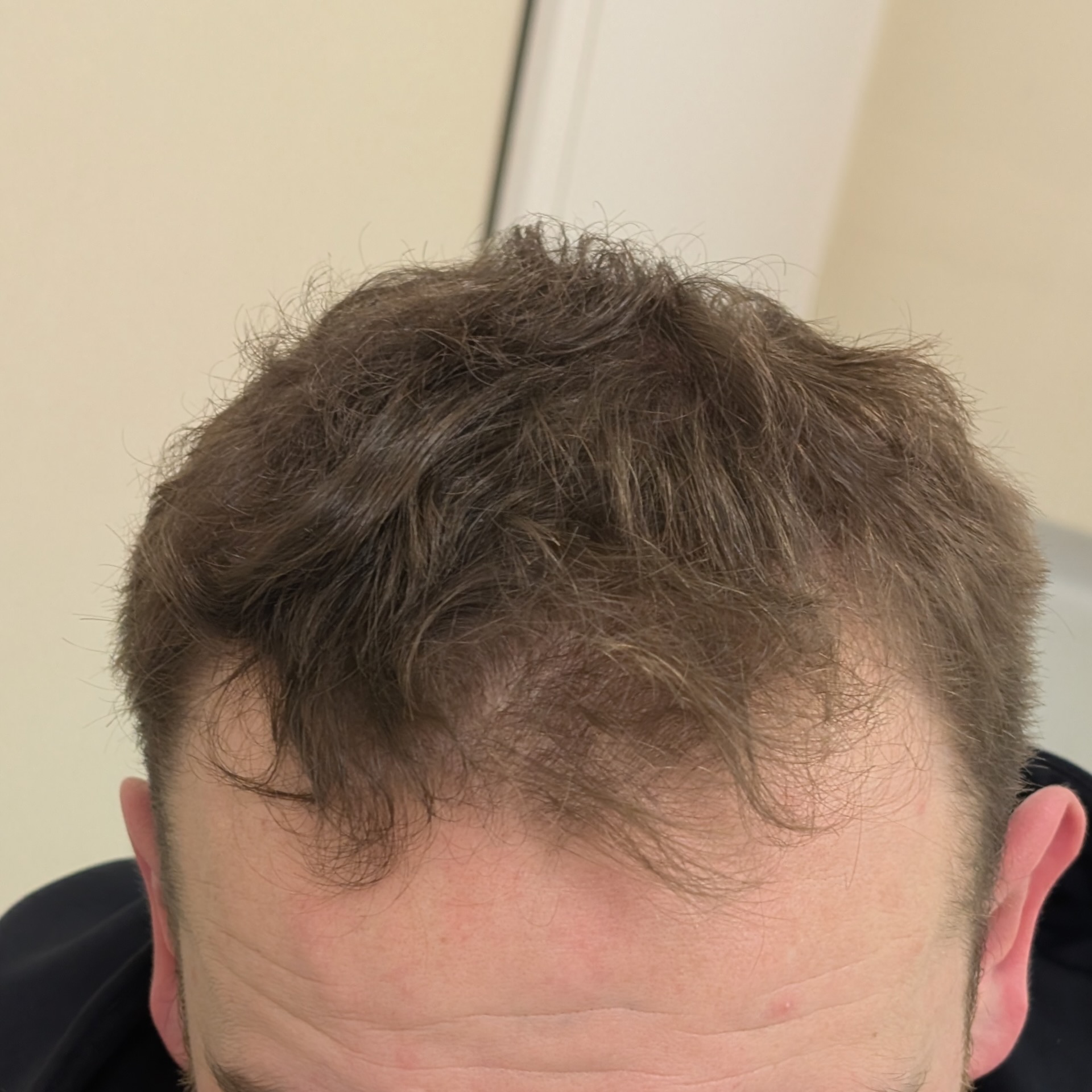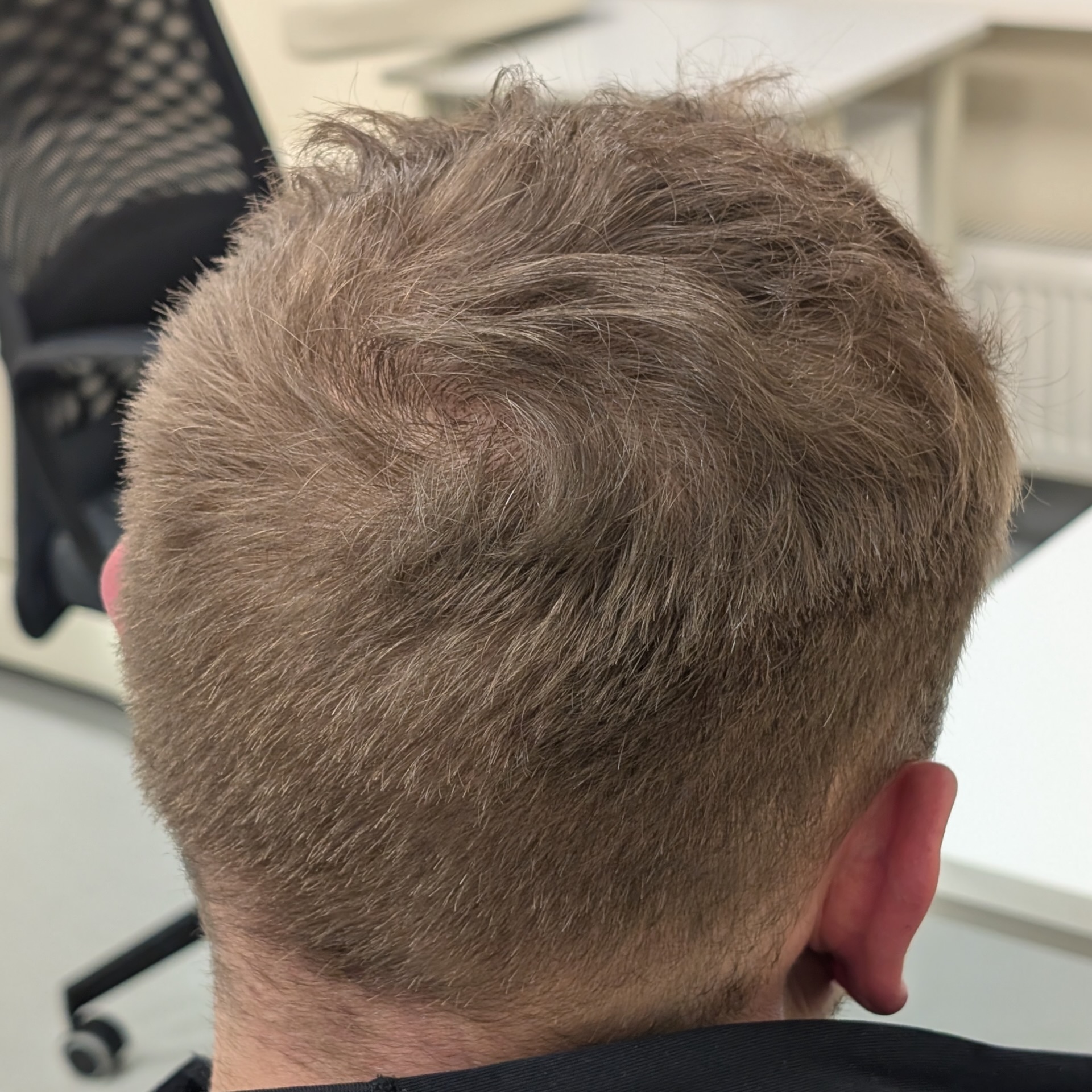 Ten pacjent zgłosił się do nas celem zagęszczenia szczytu głowy oraz niewielkiego uzupełnienia okolicy czołowej. Przeszczepiliśmy 2900 mieszków metodą FUE/DHI, koncentrując się na maksymalnym zagęszczeniu przerzedzenia w okolicy szczytu, uzyskując naturalny efekt i płynne połączenie z otaczającymi włosami – pacjent jest zadowolony z rezultatu. Zdjęcia zostały wykonane po 9 miesiącach od zabiegu.