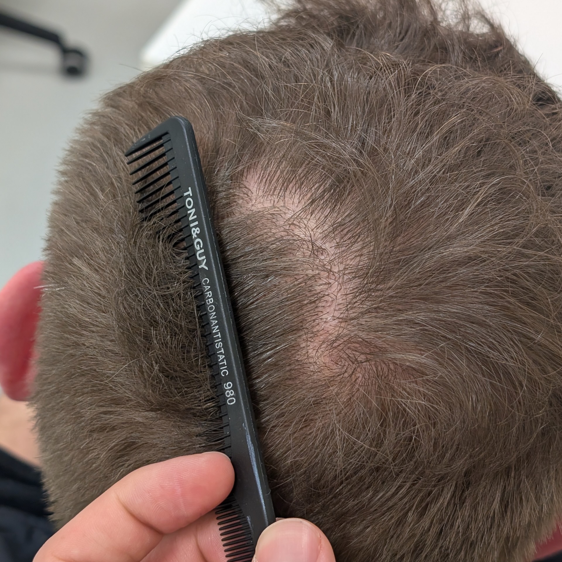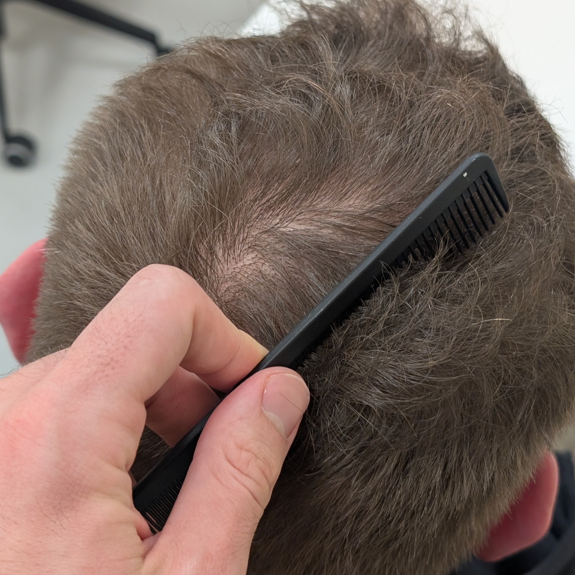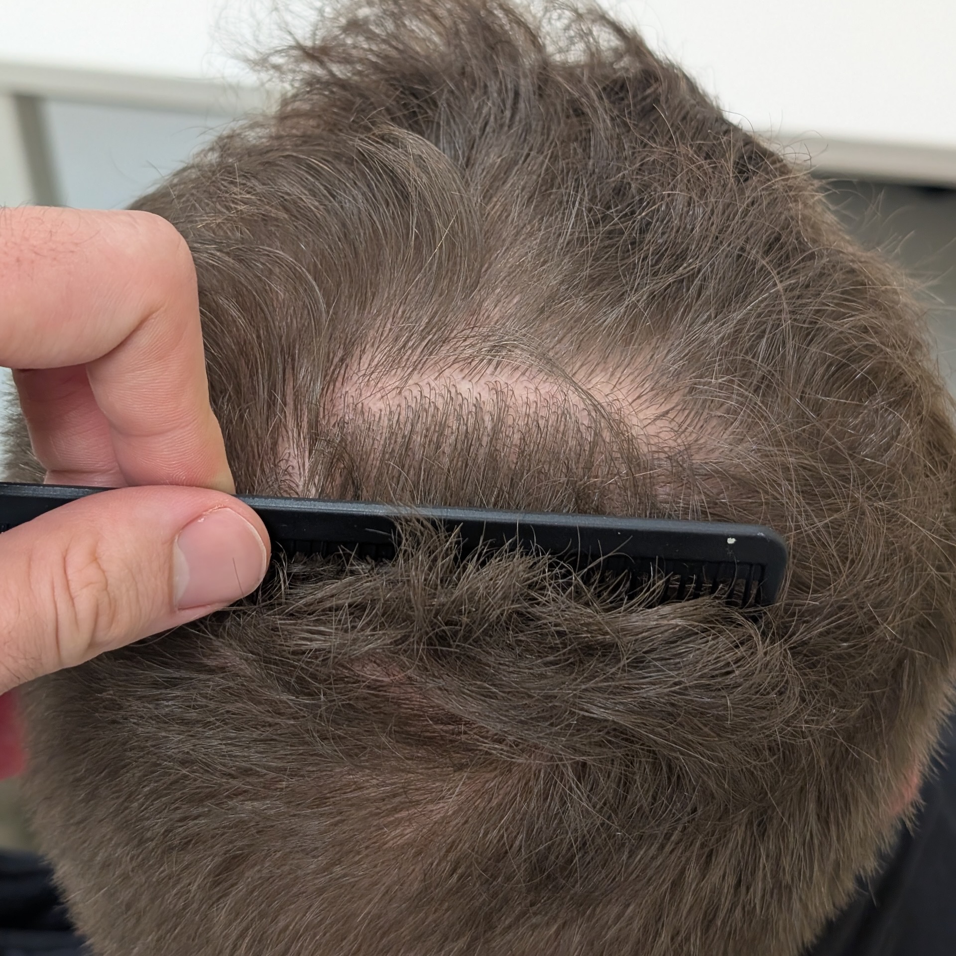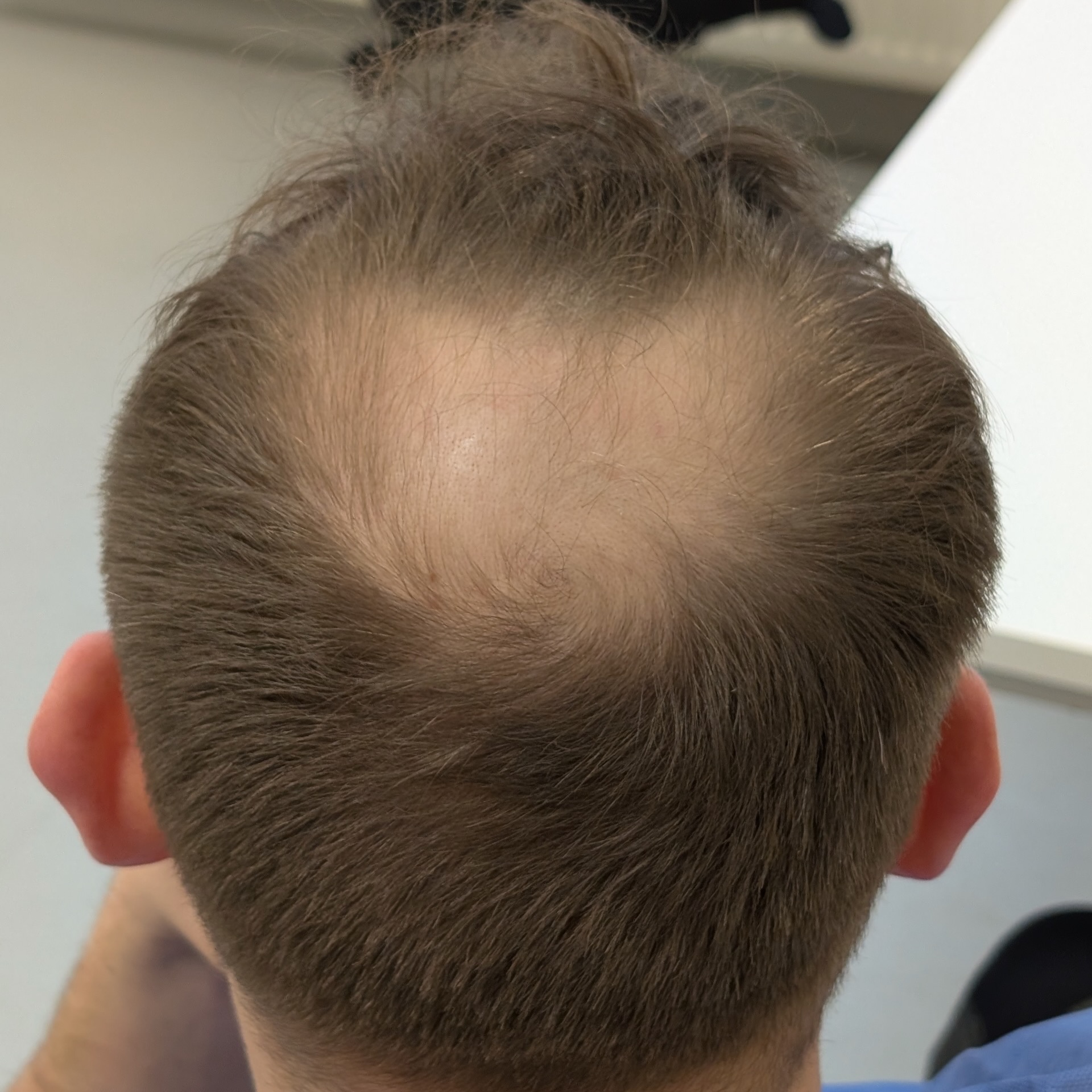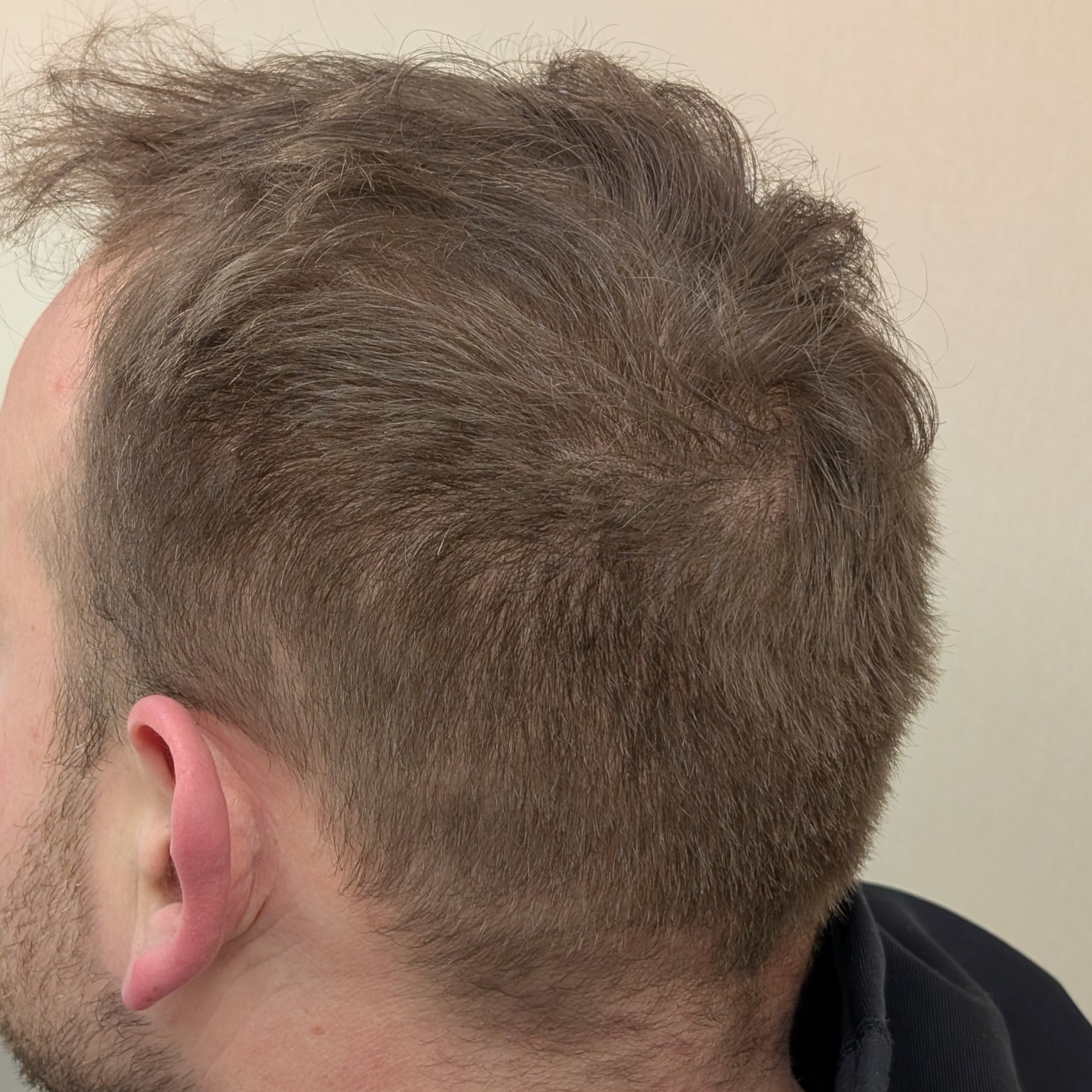 Ten pacjent zgłosił się do nas celem zagęszczenia szczytu głowy oraz niewielkiego uzupełnienia okolicy czołowej. Przeszczepiliśmy 2900 mieszków metodą FUE/DHI, koncentrując się na maksymalnym zagęszczeniu przerzedzenia w okolicy szczytu, uzyskując naturalny efekt i płynne połączenie z otaczającymi włosami – pacjent jest zadowolony z rezultatu. Zdjęcia zostały wykonane po 9 miesiącach od zabiegu.